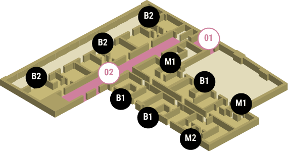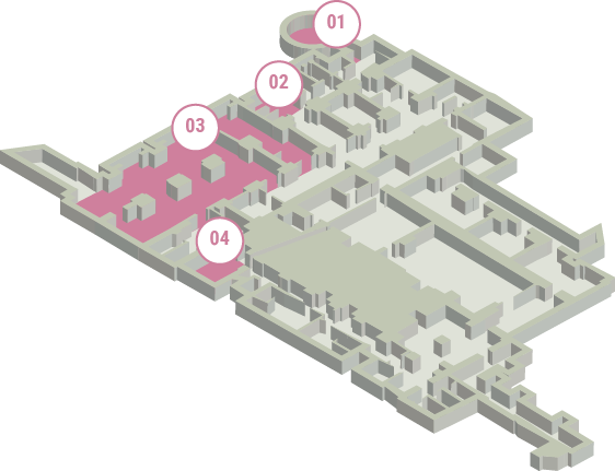 Nell’angolo dell’ampio corridoio attiguo troveranno luogo due grandi sinopie dell’importante affresco di Francesco del Cossa (Ferrara, 1436-1478) raffigurante la Madonna e il Bambino su un trono, circondata da una raffinatissima cornice con angeli reggenti candelieri e scorci di paesaggio, testimonianze uniche di uno degli affreschi quattrocenteschi più importanti della città, conservato nella chiesa del Baraccano, anch’essa di proprietà dell’ASP.