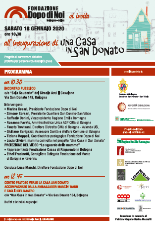 Sabato 18 gennaio presso il Circolo Arci Il Casalone in via San Donato, 149 alle ore 10.30 si terrà l'evento pubblico di inaugurazione di "Una Casa a San Donato". Partecipa, tra gli altri, l'Amministratrice unica di ASP Città di Bologna