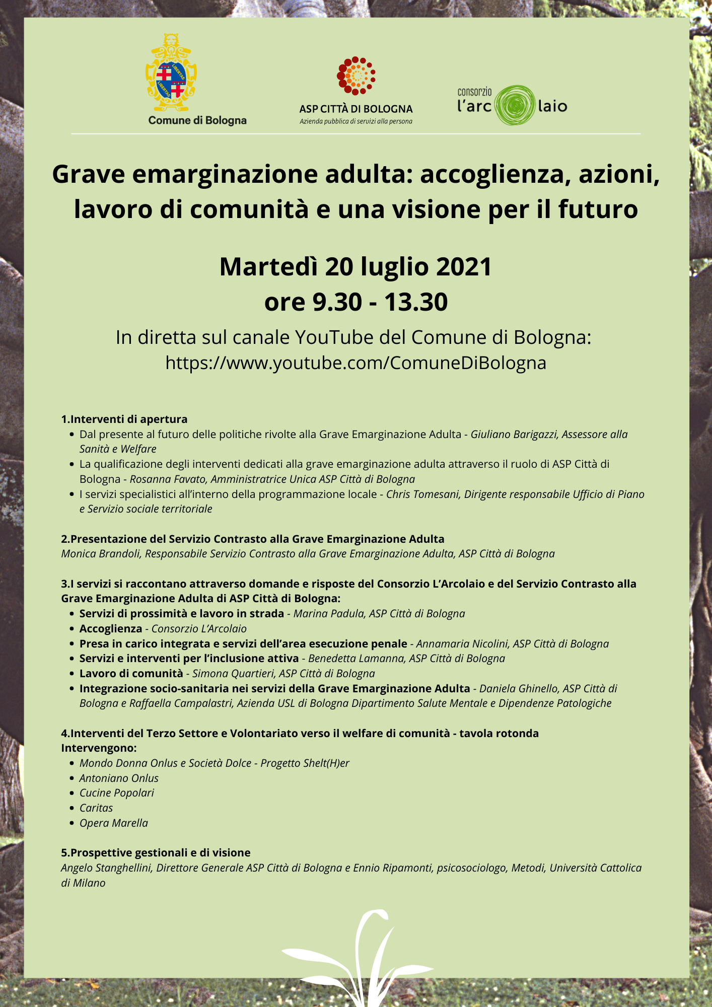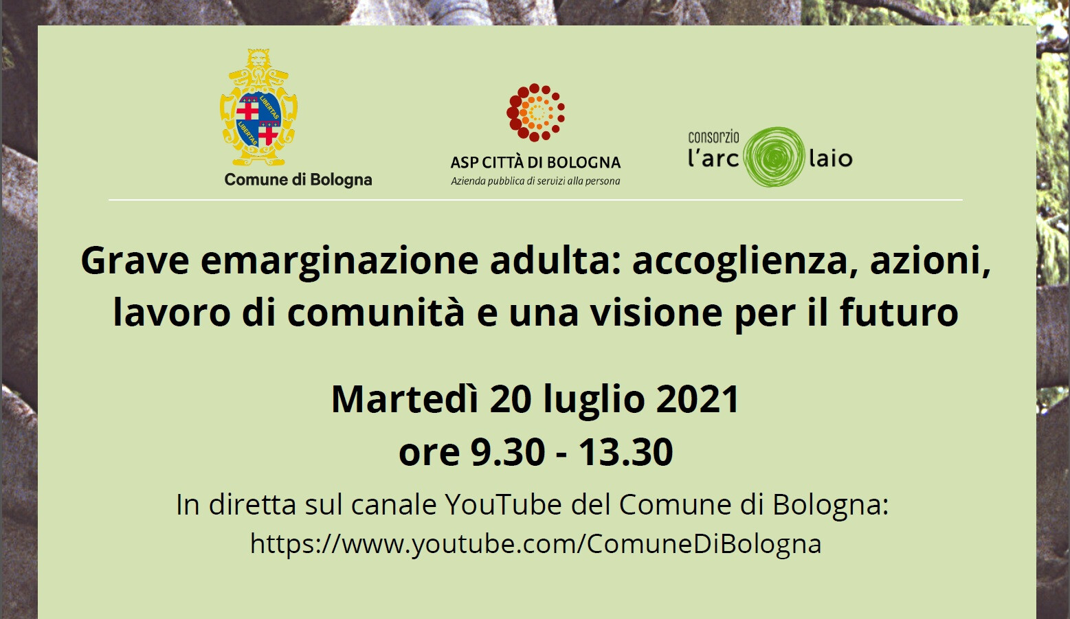 Martedì 20 luglio 2021 si è tenuto l'evento online promosso da Comune di Bologna e da ASP Città di Bologna su “Grave emarginazione adulta: accoglienza, azioni, lavoro di comunità e una visione per il futuro”. L’iniziativa è stata occasione per illustrare e restituire alla città le azioni di contrasto alla grave emarginazione adulta svolte dal Comune di Bologna, da ASP Città di Bologna insieme a cooperative, soggetti del Terzo settore e del volontariato. Insieme alle operatrici e agli operatori abbiamo ripercorso gli interventi messi in campo e guardato al futuro con una visione per affrontare le prossime sfide.