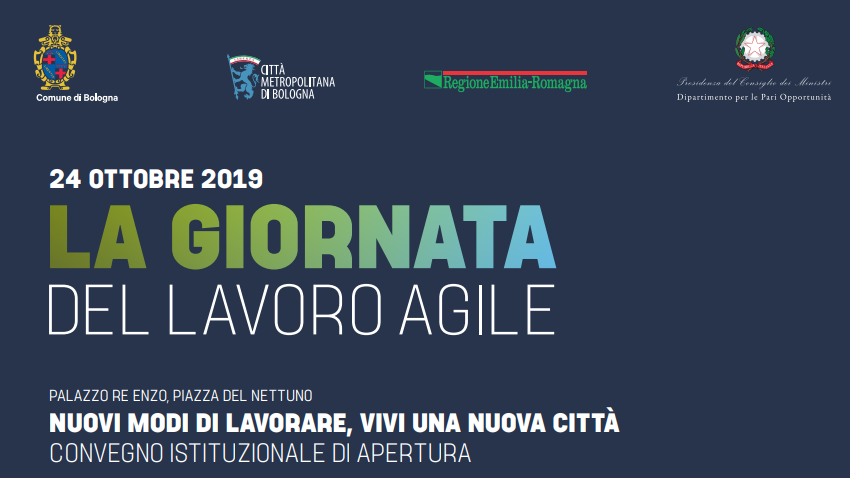 Il 24 Ottobre 2019 il Comune di Bologna, Regione Emilia-Romagna, Città Metropolitana di Bologna e Dipartimento per le Pari Opportunità della Presidenza del Consiglio dei Ministri organizzano la Giornata del Lavoro Agile 2019 – Futuro sostenibile in comune, nell’ambito del Festival After - Futuri digitali.