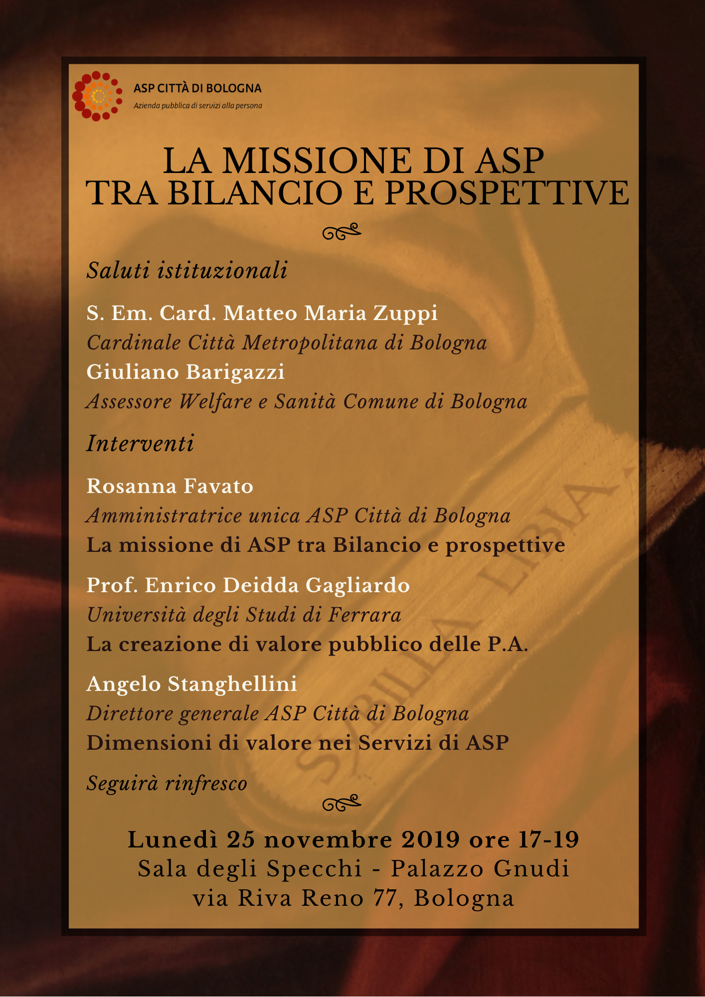 Lunedì 25 novembre alle ore 17 in Sala degli Specchi di Palazzo Gnudi in Via Riva Reno 77, Bologna avrà luogo la conferenza pubblica “La missione di ASP tra Bilancio e prospettive”.