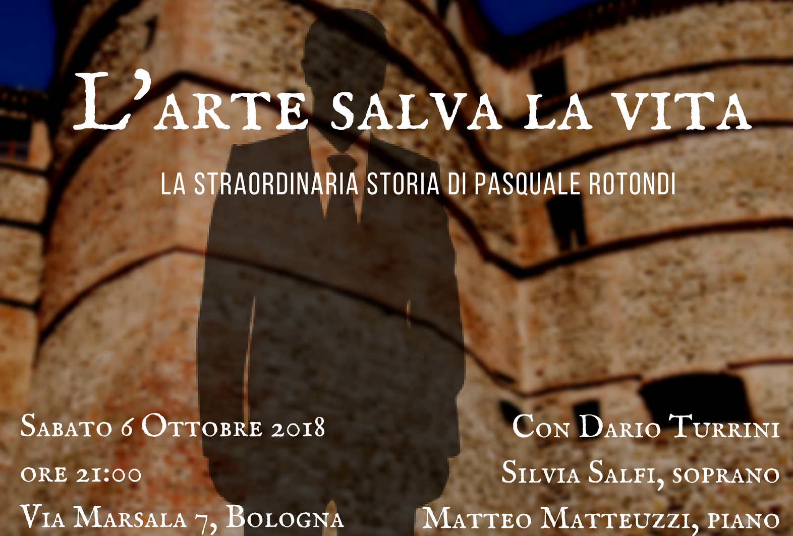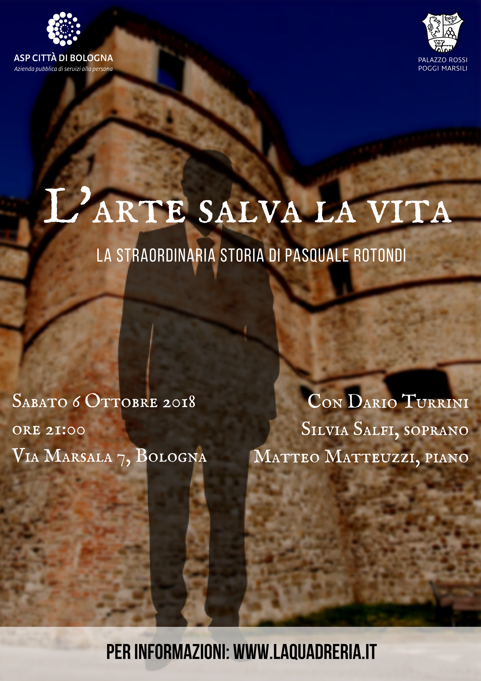 Il 6 Ottobre 2018, alle ore 21:00, presso la Quadreria di ASP Città di Bologna in Via Marsala 7 ha avuto luogo lo spettacolo “L’arte salva la vita”, a cura di Dario Turrini (attore), Matteo Matteuzzi (piano) e Silvia Salfi (soprano), che narra la storia del sovrintendente Pasquale Rotondi, che salvò più di diecimila opere d’arte durante la Seconda Guerra Mondiale per tutelarle dall’esercito nazista e dalle distruzioni della guerra.