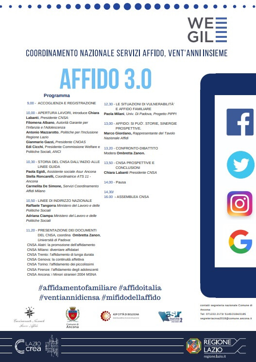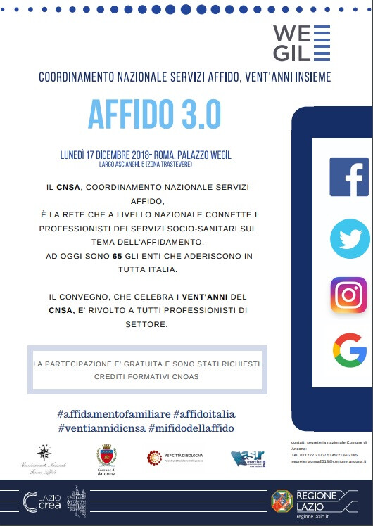 In occasione dei vent'anni della sua attività, lunedì 17 dicembre 2018 dalle ore 9.00 alle ore 17.00, a Roma, Palazzo Wegil, si terrà il Coordinalmento Nazionale Servizi Affido.