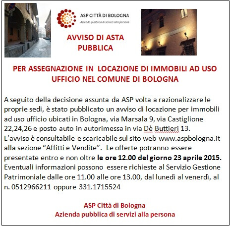 A seguito della decisione assunta da ASP volta a razionalizzare le proprie sedi, è pubblicato un avviso di locazione per immobili ad uso ufficio ubicati in via Marsala 9, via Castiglione 22, 24, 26 e posto auto in via Dé Buttrieri 13. L'avviso è scaricabile nella pagina Affitti e Vendite. Gli immobili potranno essere visionati previo appuntamento al numero 051/2966211. Scadenza avviso ore 12:00 del giorno 23.04.2015.
