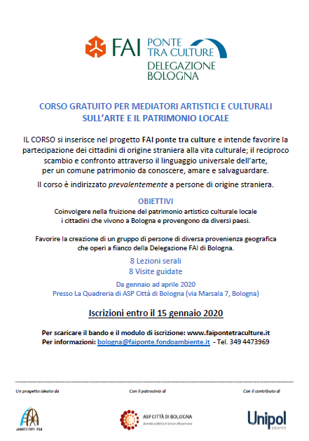E' in partenza una nuova edizione della Formazione sulla storia e sull'arte a Bologna organizzato dal FAI Emilia Romagna, con il patrocinio di ASP Città di Bologna. Il corso è gratuito ed è rivolto prevalentemente a cittadini di origine straniera interessati a conoscere e far conoscere la storia, la cultura e i monumenti di Bologna. La formazione comprende 8 visite sul territorio e 8 lezioni teoriche che si terranno nella Sala delle Mappe della Quadreria di ASP in via Marsala 7, Bologna, da gennaio ad aprile 2020. I mediatori artistico-culturali così formati potranno fare da "ciceroni" in diverse lingue, accompagnando turisti e altri cittadini alla scoperta della città.