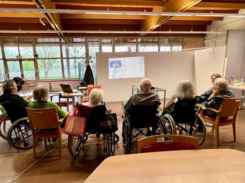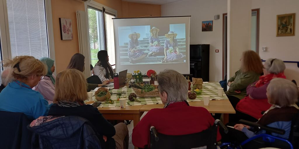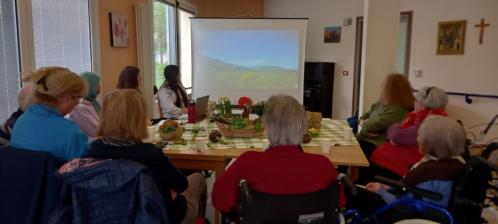 La richiesta di condividere un pensiero sulla primavera innesca una catena di reazioni: “il caldo che comincia a scaldare”, secondo Fiorella; “i fiori, quando aprile si prende i meriti di marzo”, per Marilena e Eulalia. E dai fiori si dipana un nuovo flusso di pensieri: “gli asparagi li raccoglievamo la mattina e di pomeriggio ce n’erano già dei nuovi, crescevano in fretta” , ricorda Angelina prima di notare anche quanto è bella, fiorita, la magnolia che cresce nel parco della struttura e si vede dalle finestre di un corridoio.