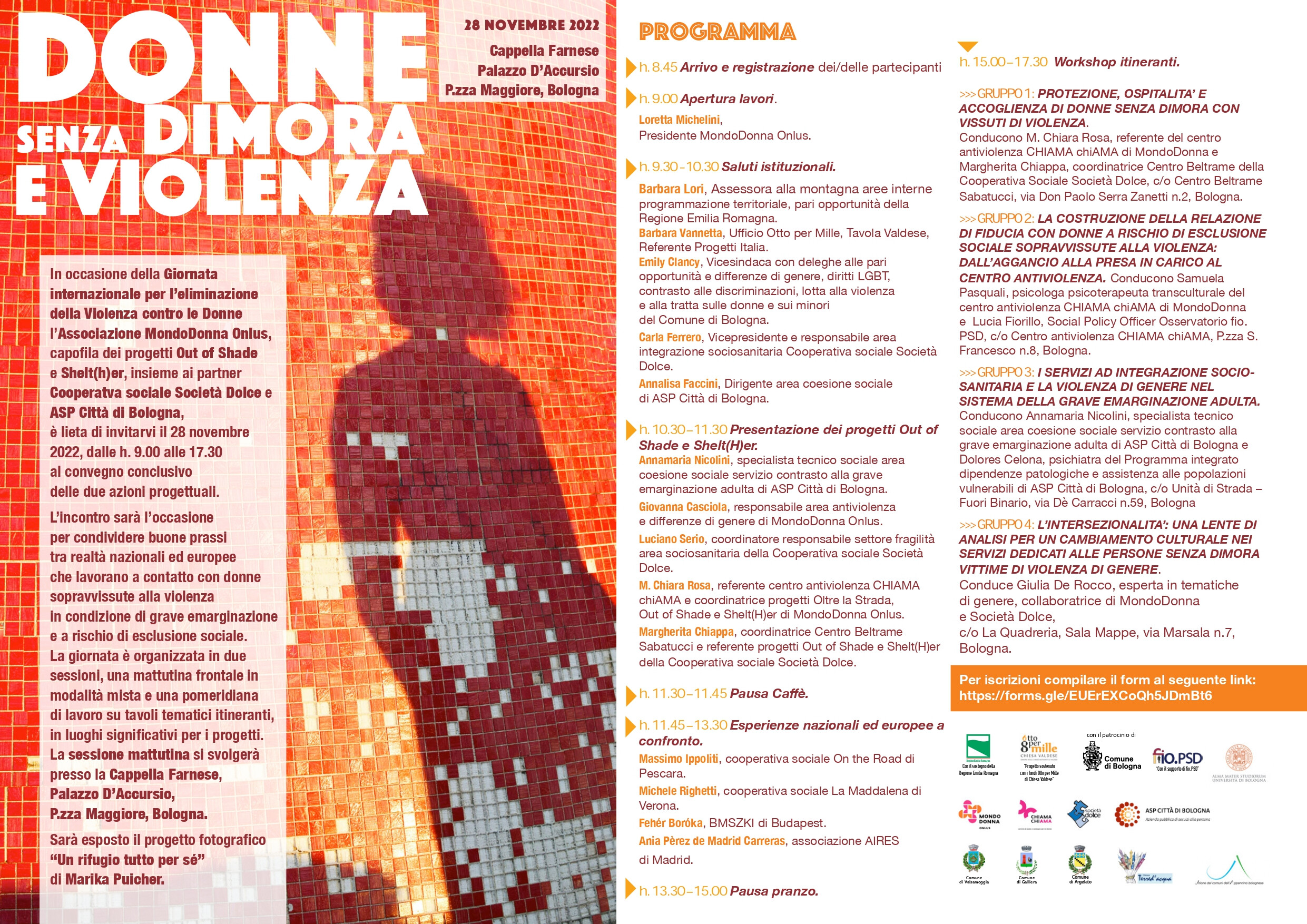 Lunedì 28 novembre, in occasione della "Giornata Internazionale per l’eliminazione della violenza contro le donne" l’Associazione Mondo Donna Onlus ha organizzato “Donne Senza Dimora e Violenza”, il convegno conclusivo dei progetti Out Of Shade e Shelt(H)er, che ci hanno visti partner insieme a Cooperativa Sociale Società Dolce.