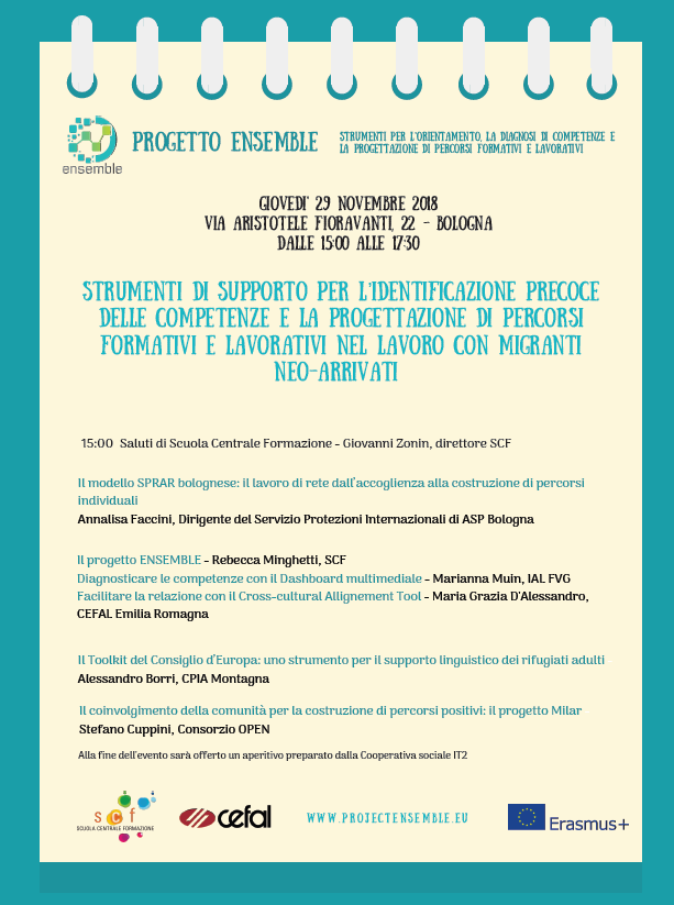 Giovedì 29 novembre a Bologna in via Fioravanti 22 a partire dalla ore 15.00 si svolgerà il workshop dal titolo "Strumenti di supporto per l'identificazione precoce delle competenze e la progettazione di percorsi formativi e lavorativi nel lavoro coi migranti neo-arrivati" promosso dalla Scuola Centrale Formazione in collaborazione con Cefal Emilia Romagna. L'obiettivo del workshop mira a sviluppare strumenti che permettano ai migranti di auto-valutare le proprie competenze e agli operatori di individuare percorsi appropriati alle abilità e alle competenze di ciascuno.