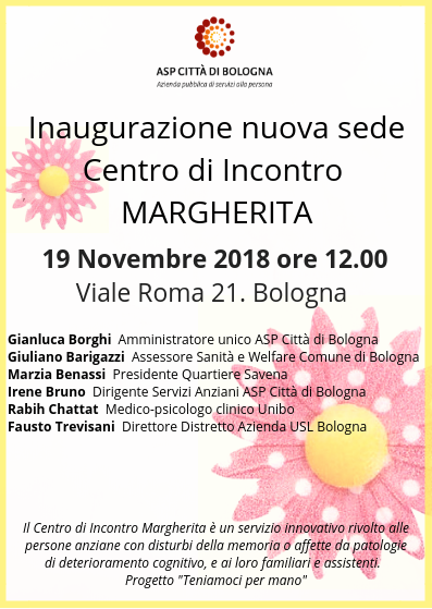 Il Centro di Incontro Margherita è un servizio rivolto alle persone con disturbi della memoria o affette da patologie di deterioramento cognitivo, ai loro familiari e assistenti, mirato a sostenerli e accompagnarli. Un luogo di ascolto, sostegno e accompagnamento nel percorso di evoluzione della malattia.