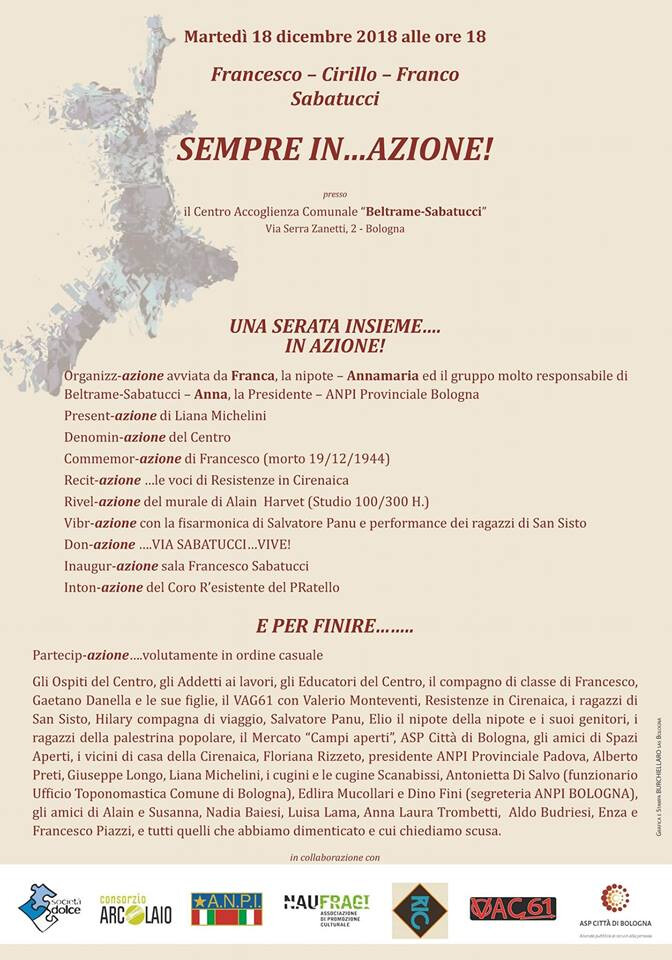 L'avvenimento dell’intitolazione della sala multifunzionale a Francesco Sabatucci, sarà un’occasione per fare memoria di Resistenza, all’insegna di performances e sorprese, con la partecipazione e la testimonianza di protagonisti di ieri e di oggi.
