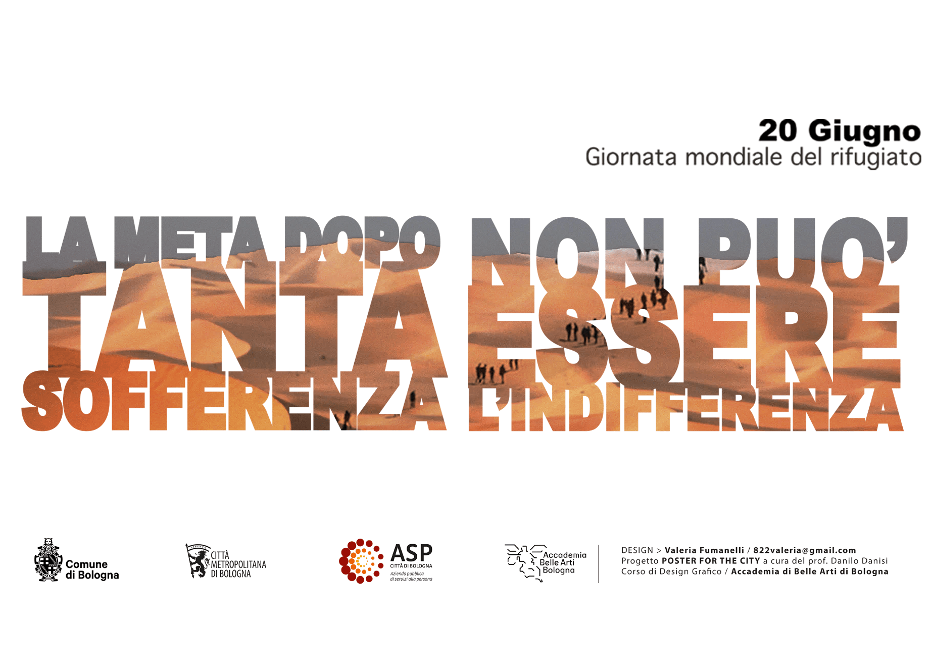 L’immagine ufficiale del “20 giugno” per il 2025 è stata realizzata da Valeria Fumanelli, studentessa del corso di Design Grafico del prof. Danilo Danisi presso l’Accademia di Belle Arti di Bologna che, nell’ambito del progetto POSTER FOR THE CITY, da tempo collabora con il Comune di Bologna per elaborare i manifesti delle giornate istituzionali. Tra le varie proposte, l’immagine di Fumanelli è stata scelta, oltre che per l’impatto grafico, per il suo invito a superare l’indifferenza verso le persone che fuggono da situazioni di guerra ed estrema povertà per chiedere protezione.