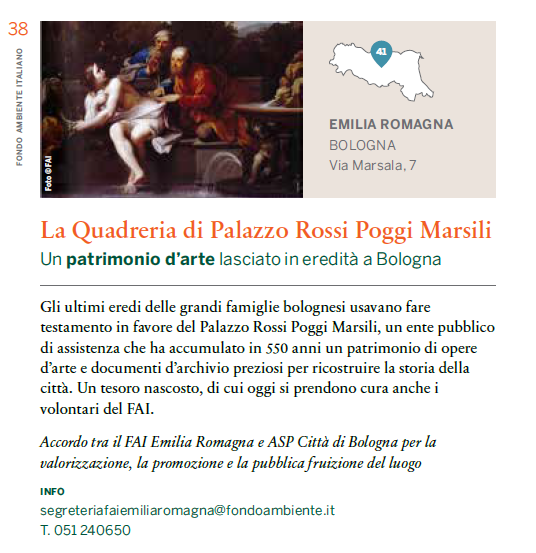 A partire da Settembre verrà divulgato il nuovo opuscolo FAI "Vieni a vivere una giornata unica al mondo", dove è citata come luogo di interesse anche la Quadreria di Palazzo Rossi Poggi Marsili, bene promosso dai volontari del FAI.