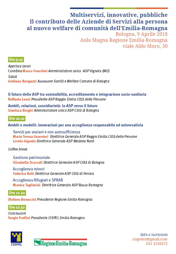 “Multiservizi, innovative, pubbliche. Il contributo delle Aziende di Servizi alla persona al nuovo welfare di comunità dell’Emilia-Romagna” è il titolo del convegno organizzato da Cispel in collaborazione con la Regione Emilia-Romagna di lunedì 9 aprile in Aula Magna della Regione Emilia-Romagna.
