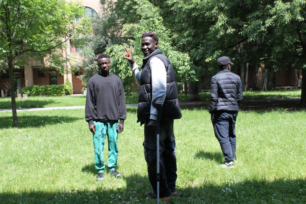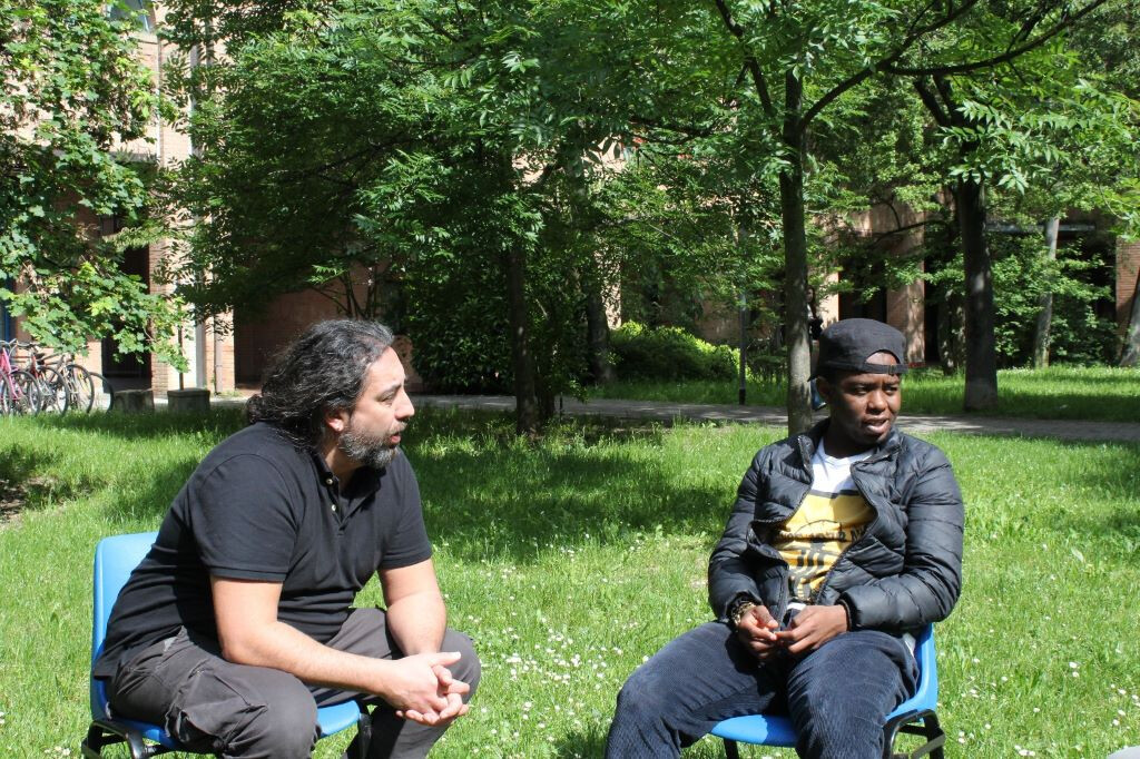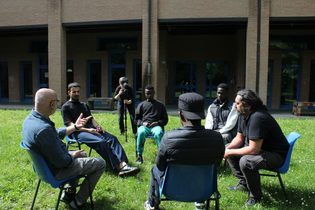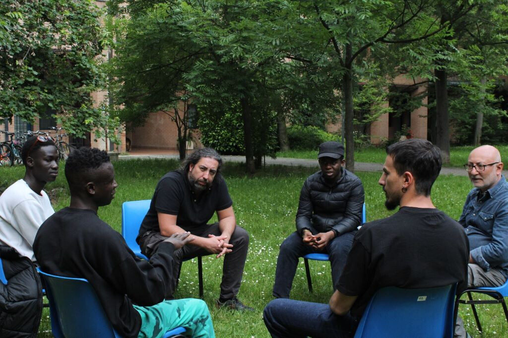 Così, Musa, Mohamed e Junior hanno accettato di innescare, dentro l'esperienza data, un dialogo sociale, per raccontare cosa di loro vogliono portare dentro il discorso artistico. Si è scelto così di disporre, nel bellissimo giardino del Centro Interculturale Zonarelli, delle sedie in cerchio, dove potersi ritrovare e raccontare.