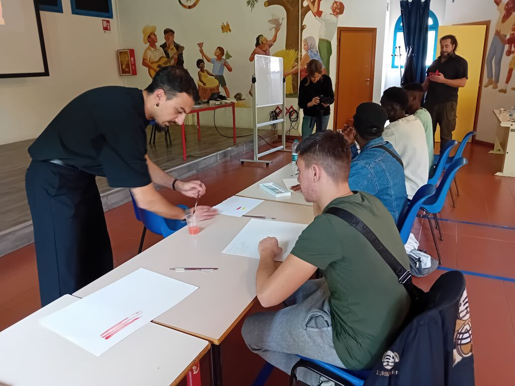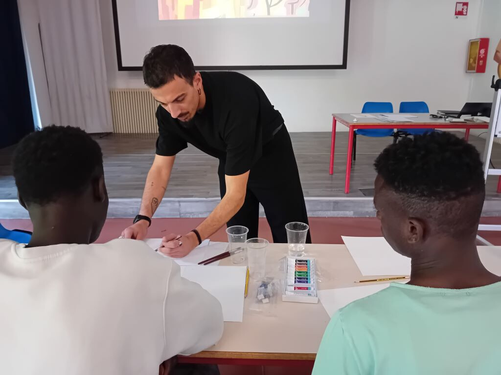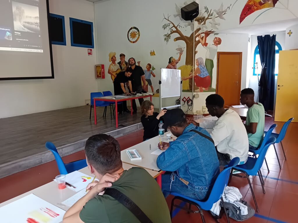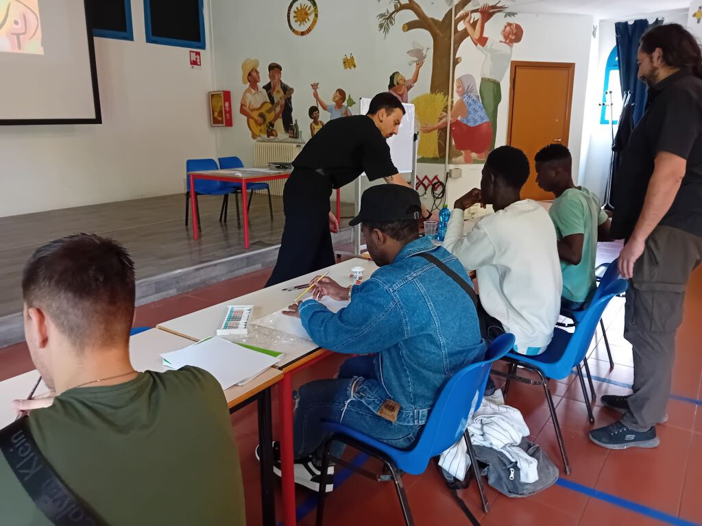 La mattina di sabato 13 aprile è cominciata con una novità: Shanawar, il ragazzo pakistano, non si è presentato, ma al suo posto è arrivato Junior, del Camerun, che ha portato con sé un quaderno pieno dei suoi disegni, mostrandoli orgoglioso al tutor Vincenzo Sarli: "Sono molto belli! Complimenti..." Il ragazzo, compiaciuto, si siede in attesa di iniziare: "Il laboratorio MistArt – ci dice Sarli - ormai sembra ben avviato. Sono felice di notare un maggiore coinvolgimento dei ragazzi, che a volte hanno da dire e da trasmettere più di quanto si possa immaginare. Il percorso con cui si procede li mette in condizione di assimilare le basi della produzione pittorica e artistica, per poi sperimentare di sana pianta." Con l'arrivo di Junior le lingue utilizzate per l'interazione con i ragazzi diventano tre: all'italiano e all'inglese si