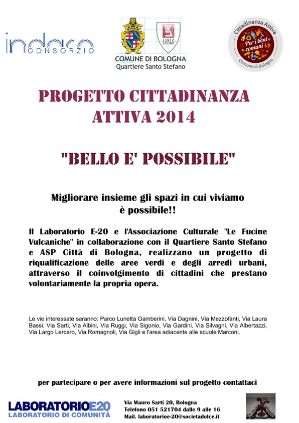 Il "Laboratorio E-20", laboratorio di comunità e integrazione sociale e l'Associazione culturale "Le Fucine Vulcaniche", in collaborazione con il Quartiere Santo Stefano e Asp Città di Bologna, realizzano "Bello è possibile", un progetto di riqualificazione delle aree verdi e degli arredi urbani, attraverso il coinvolgimento di cittadini che prestano volontariamente la propria opera.