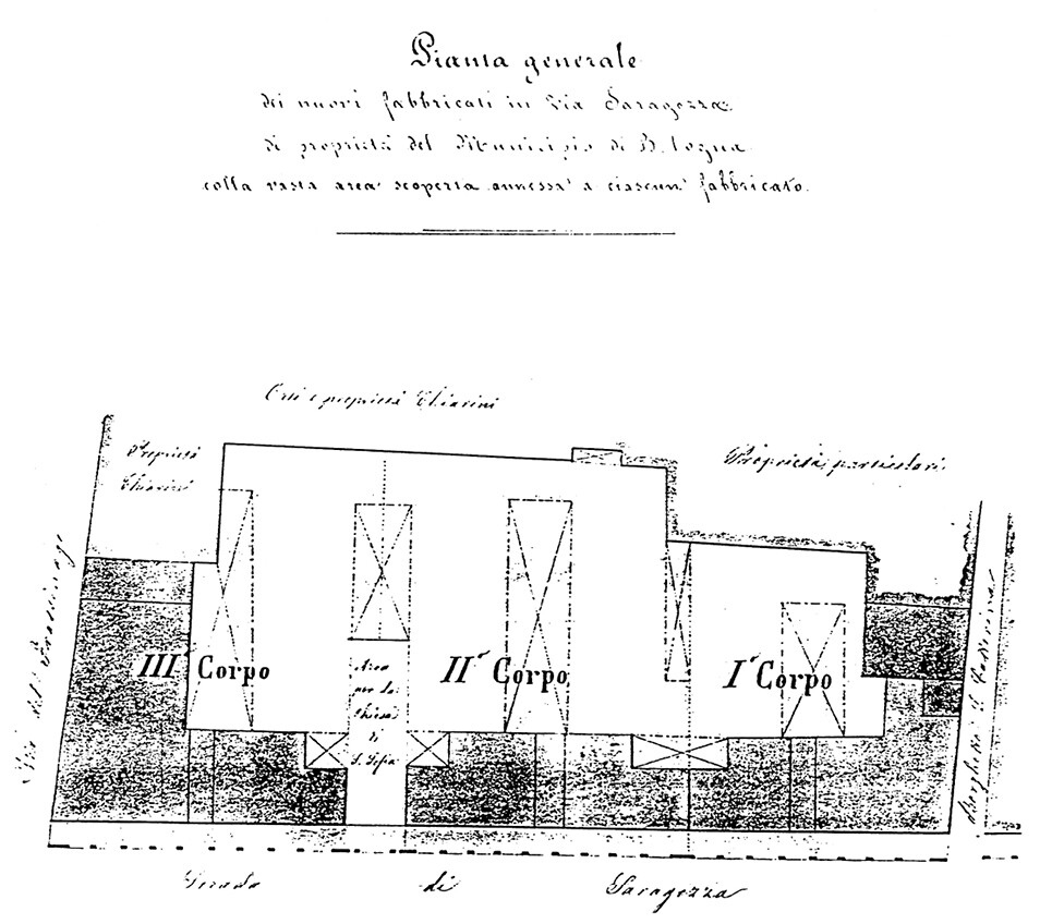 Progettato dall’ingegnere capo dell’Ufficio tecnico del Comune di Bologna, Coriolano Monti, tra 1861 e il 1865, si inserisce all’interno dell’operazione di rinnovamento urbanistico del tratto terminale di via Saragozza. Il palazzo rientra a pieno titolo nella tipologia delle case operaie, diffusa in tutta Italia tra la metà del XIX secolo e i primi decenni del XX secolo.