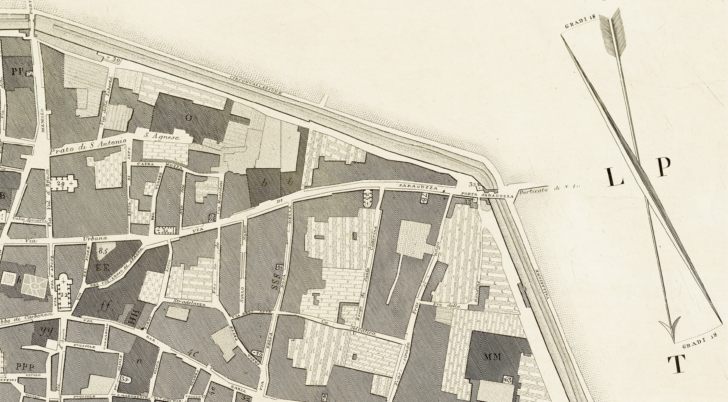 Il Governatore Farini decreta le prime trasformazioni urbanistiche postunitarie: sono dichiarati “di pubblica utilità e di urgenza” gli allargamenti di Canton dei Fiori, della via Borgo Salamo e di via Saragozza, dalla chiesa di Santa Caterina alla porta. Sono quindi avviati gli espropri dei molteplici fabbricati addossati che sorgono in prossimità di Porta Saragozza.