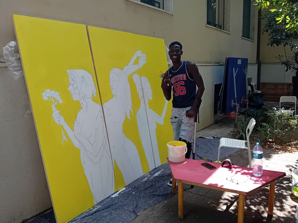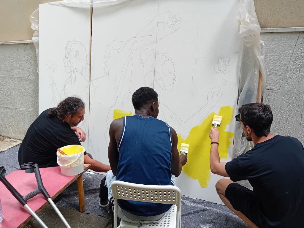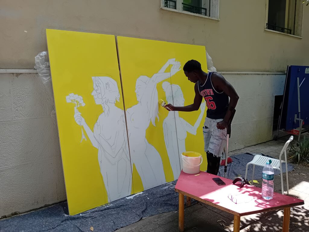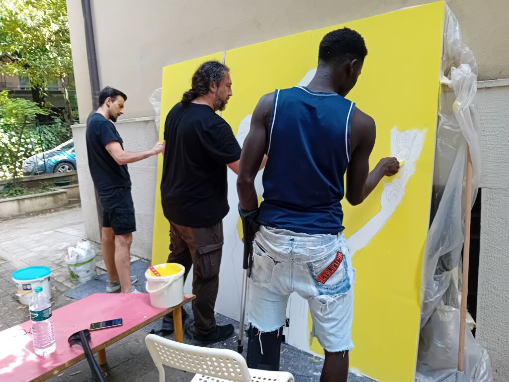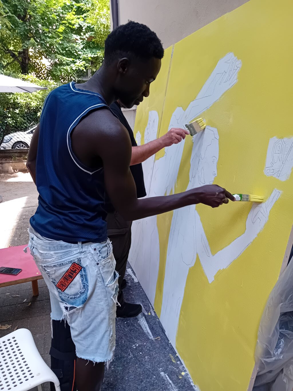 Lo staff del progetto di street art per i minori del mondo, accolti a Bologna, si è trasferito a Casa Murri, dove Musa, il giovane gambiano dalle straordinarie doti grafiche, ha avuto la possibilità continuare a partecipare alla messa appunto del murale trasferito sui pannelli.