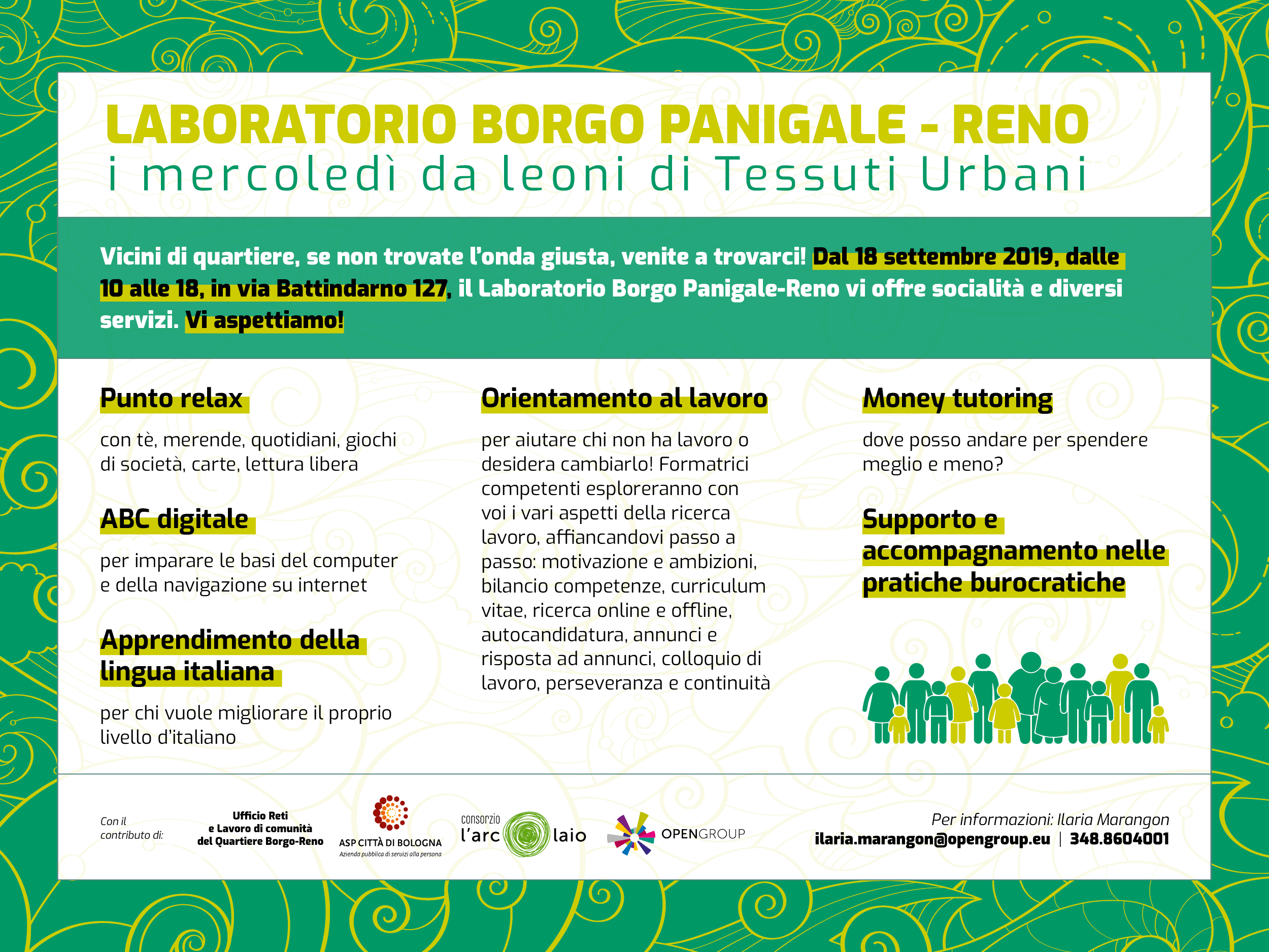Nuova apertura del laboratorio di comunità Borgo Panigale Reno in una versione rivisitata sui bisogni del territorio. Mercoledì prossimo il 18/09/19 dalle ore 10:00 alle ore 18:00 nella Sala Livatino di Via Battindarno 127, inizieranno le attività del Laboratorio Borgo Panigale-Reno per poi ritrovarsi ogni settimana nello stesso luogo e alla stessa ora.