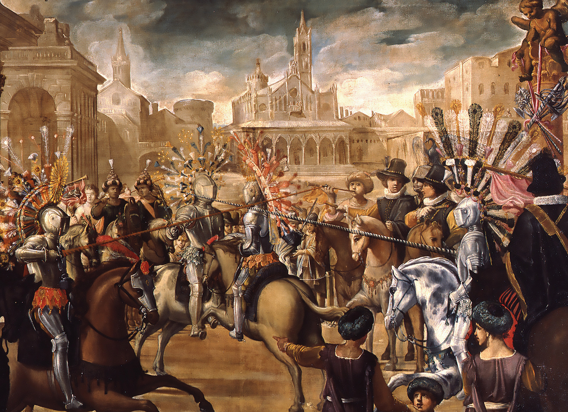 Nel lungo corridoio parallelo al giardino saranno esposte invece le grandi e spettacolari Quattro giostre o “tornei”: la Giostra di Barriera a Piedi; la Giostra di Riscontro, di Saracino, di Anello a Cavallo di anonimo artista bolognese e la Giostra di Campo Aperto a Cavallo e la Giostra di Carosello a Cavallo, già assegnate a uno sconosciuto pittore ferrarese di inizio Seicento, poi attribuite a Francesco Brizio (Bologna, 1574 ca.- 1623). Documenti eccezionali dell’epoca dei tornei delle corti emiliane, visibili dopo un lungo deposito nella Pinacoteca di Bologna.