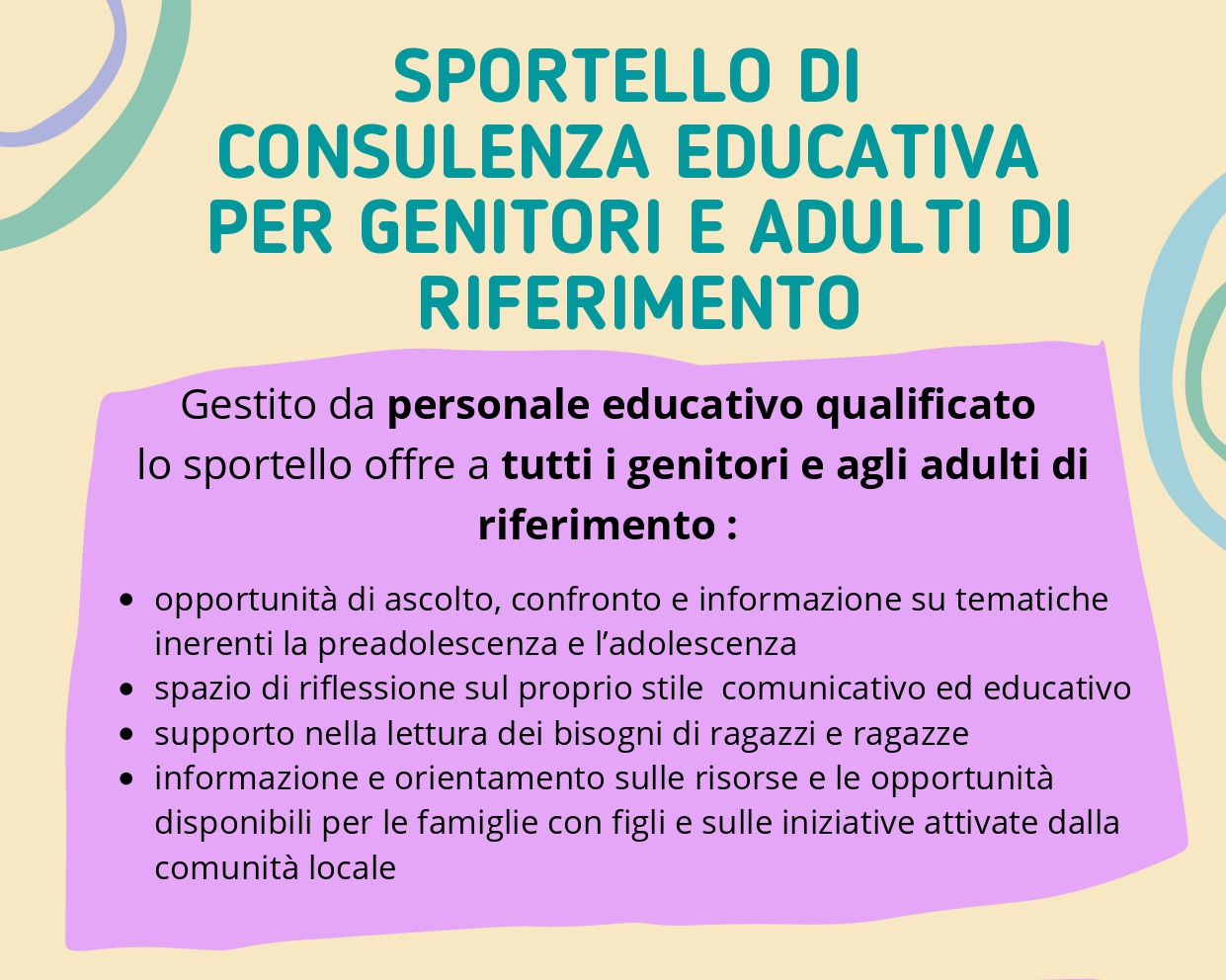 Il servizio di sportello di Consulenza Educativa, attivo all'interno del Centro per le Famiglie, costutisce un supporto alle figure dei genitori e degli adulti di rifermiento di adolescenti e preadolescenti.