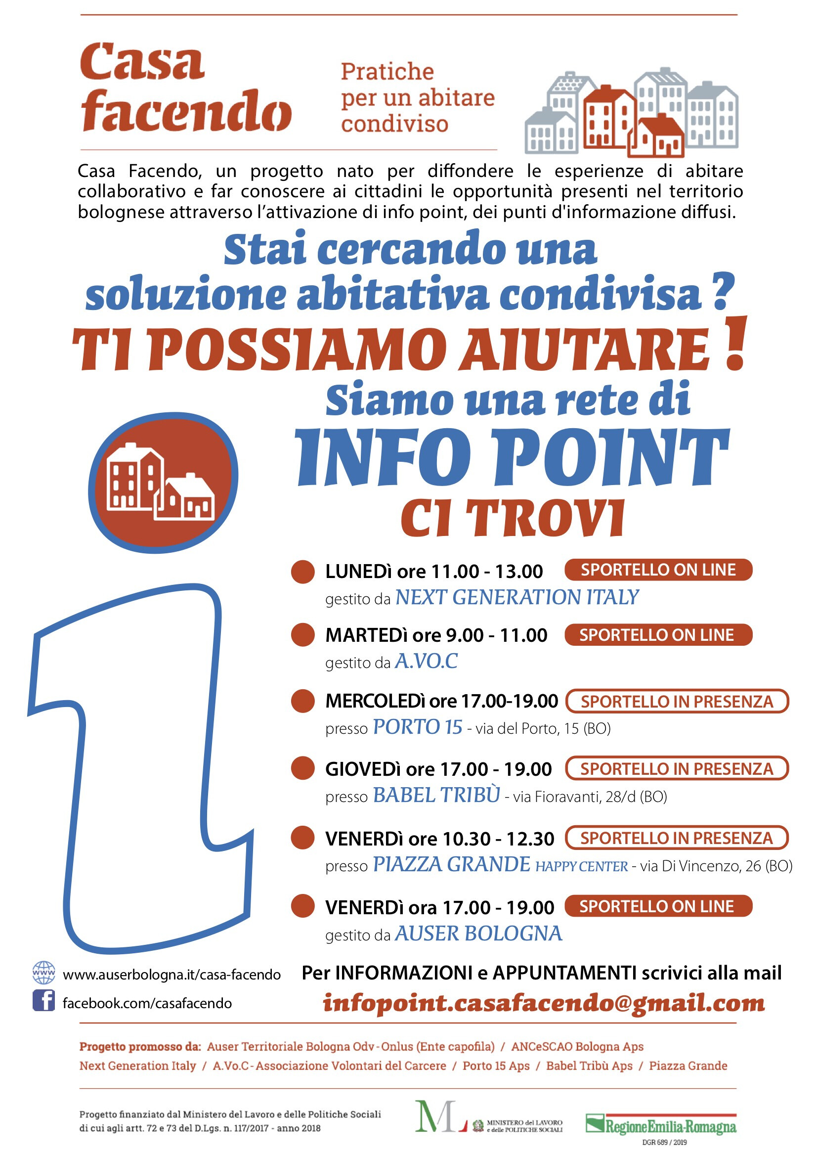 Per accedere alla rete di Info Point scrivi una e-mail a infopoint.casafacendo@gmail.com per informazioni e prenotare appuntamenti, sia in presenza sia online.