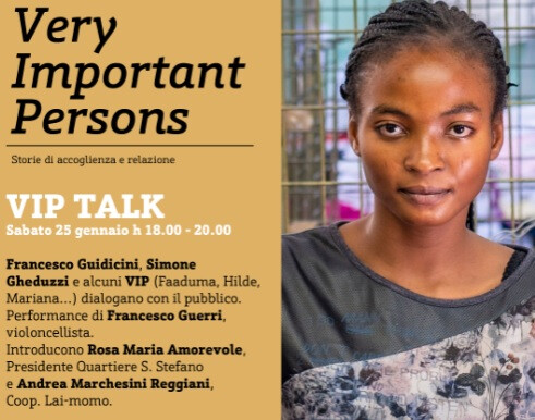 Sabato 25 gennaio dalle ore 18 alle ore 20, in occasione di Art City White Night di Arte Fiera, alcuni protagonisti dell'installazione fotografica “VIP - Very Important Persons” incontreranno il pubblico. Un dialogo a più voci, in cui le storie dei fotografati si intrecceranno ai racconti del reportage da parte di Francesco Guidicini, e le suggestioni dell’istallazione di Simone Gheduzzi saranno amplificate dalle note del violoncello del musicista Francesco Guerri, che suonerà dal vivo alcuni dei pezzi composti per “VIP”. Introducono la serata Rosa Maria Amorevole, Presidente del Quartiere S. Stefano, e Andrea Marchesini, Cooperativa Lai-momo.